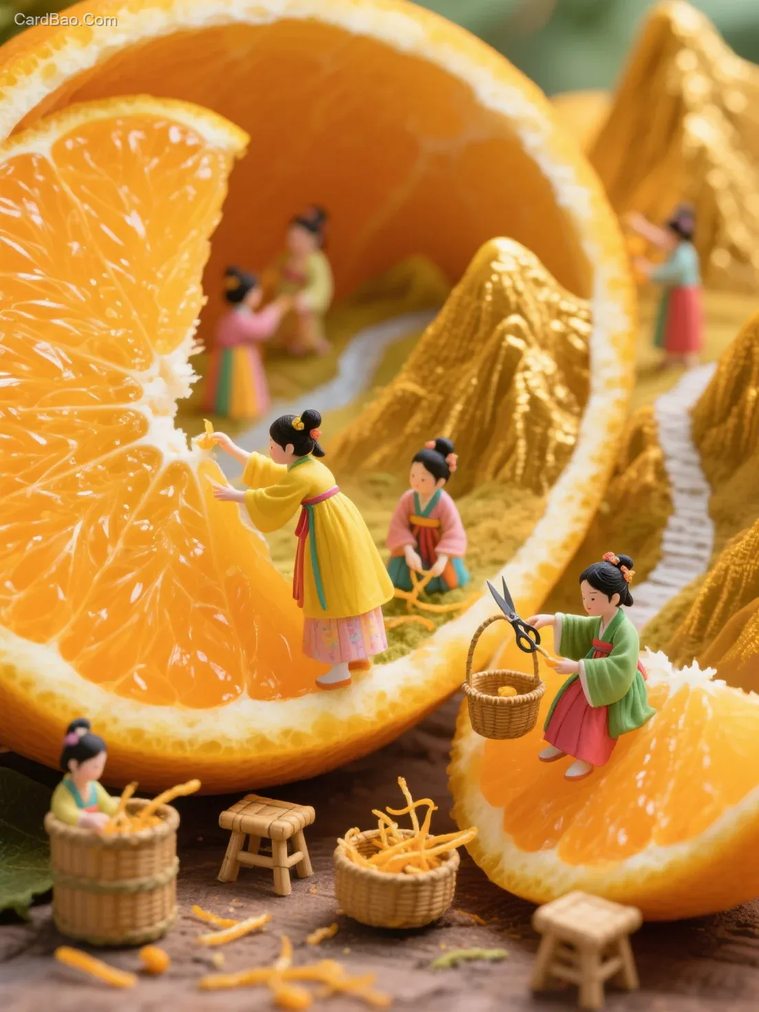 2. 古风汉服小女孩:一群身着古风汉服的小女孩小人在橙子内部劳作。她们穿着五彩斑斓的汉服,在金色的果肉间穿梭。一个身着黄色汉服的小女孩,正站在果肉瓣的边缘,努力伸手去够另一瓣上的橙子经络,准备将其采摘下来,她的身体微微前倾,脸上露出努力的神情。另一个穿着绿色汉服的小女孩,坐在一个稍大的果肉瓣上,用一把小巧的剪刀,细心地剪下橙子经络,放入身边的竹篓中,眼神中透着专注。