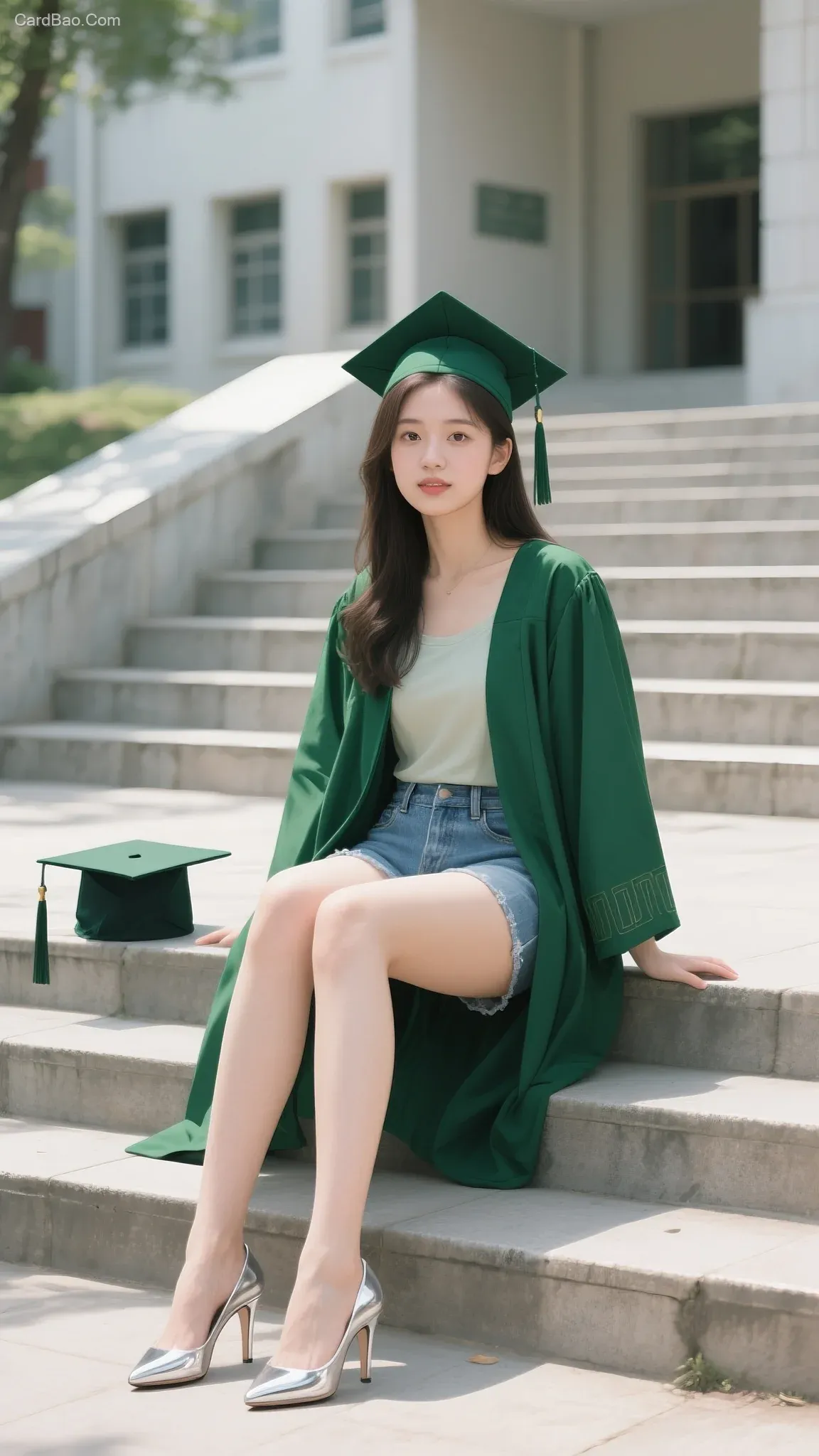 - **Theme Description**: A girl wearing a green graduation gown over a light-colored top and denim shorts, with silver stiletto heels, sitting on campus steps (graduation cap placed nearby), showcasing youthful energy and the unique essence of graduation commemoration.