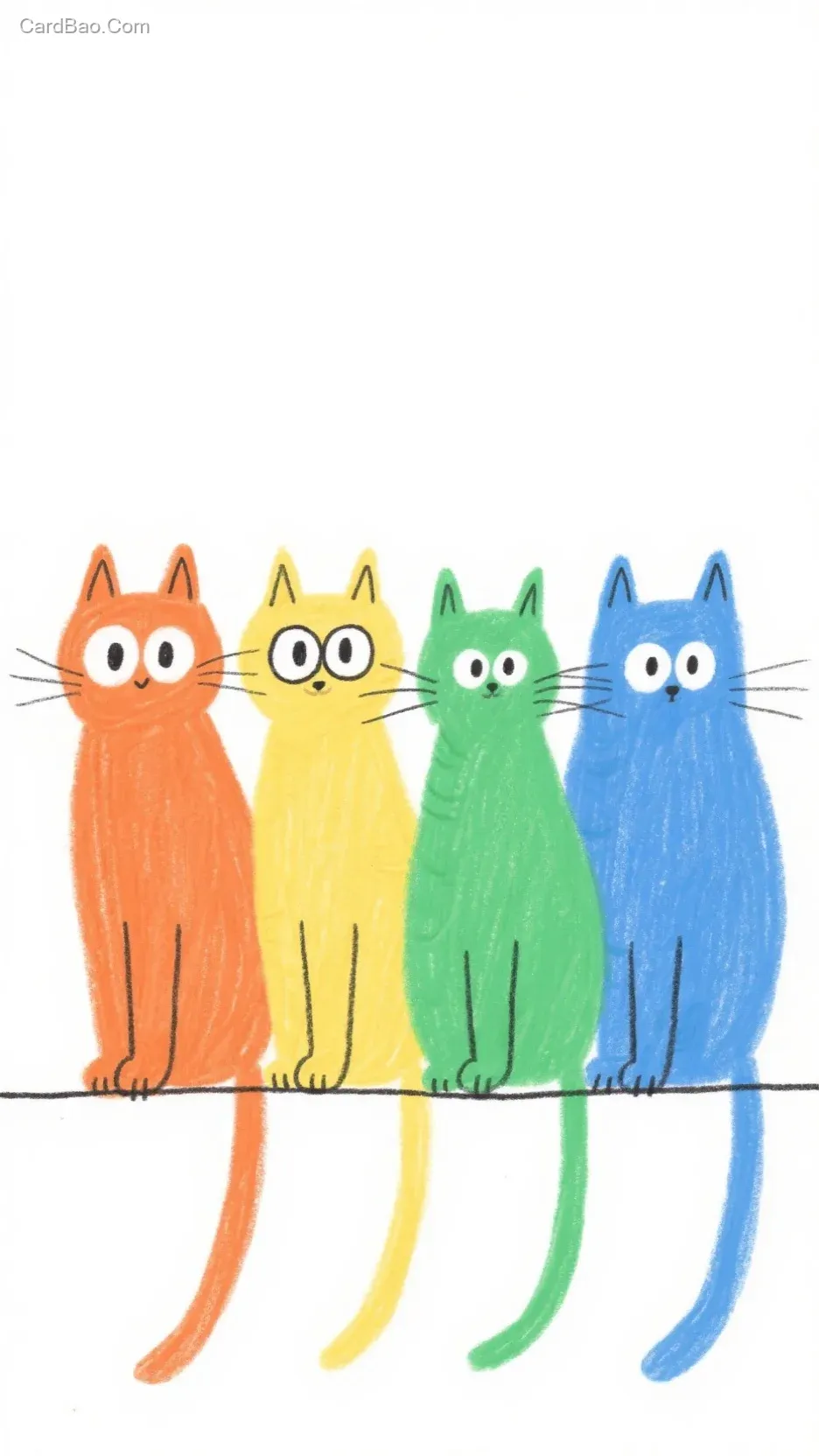 Echi插画师画风,大师之作,极高艺术、彩铅、潦草、70%大面积留白,很抽象、搞笑、有趣、可爱风格、超大眼睛、粗线条、极简、现代、4只形态各异的猫,正面、在一线横线上。紧贴着。不同的猫分别不同的颜色,纯色