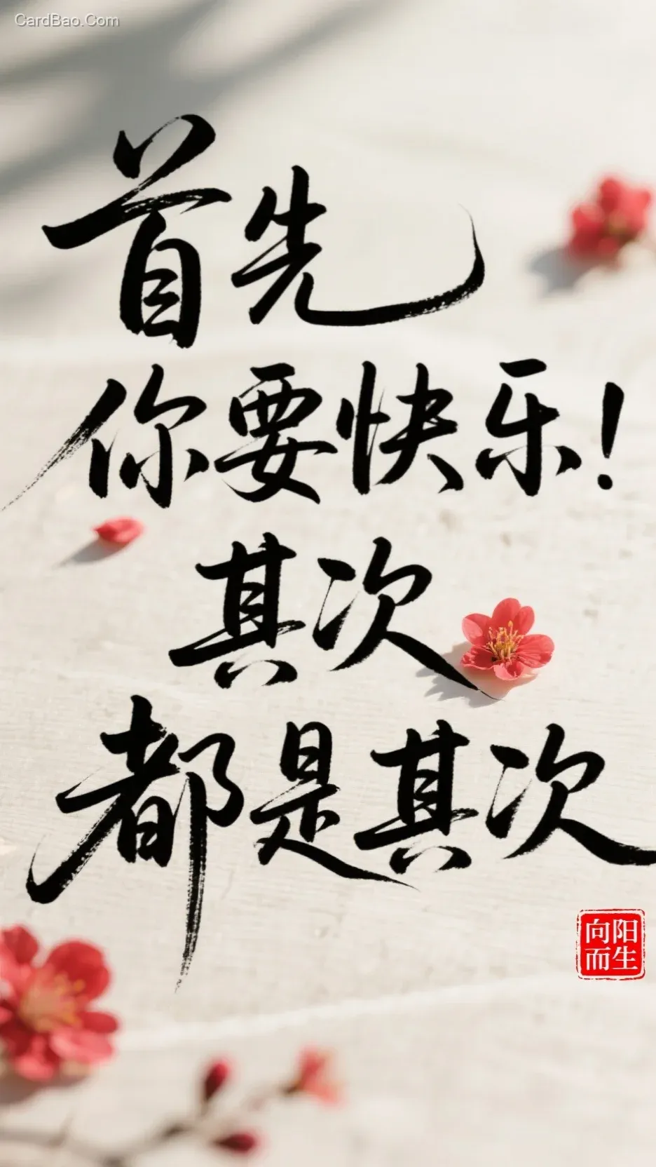 狂草作品,毛笔狂草字体,字体洒脱飘逸,苍劲有力,飞白,内容为“首先你要快乐 其次 都是其次”,飘落几朵红色花朵,右下角朱红方块印章“向阳而生”,超高清真实画质