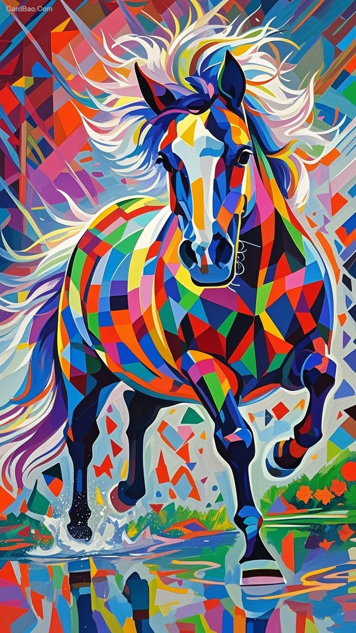 世界抽象画大师杰作,极繁主义,扁平插画,丽贝卡·莫里斯(Rebecca Morris)的风格,一匹奔跑的骏马,繁复的抽象图案,生动浓烈的色彩,纹理叠加,动感的抽象构图,自由奔放的抽象风格,高品质细节,超高清分辨率,最佳品质,8K壁纸,