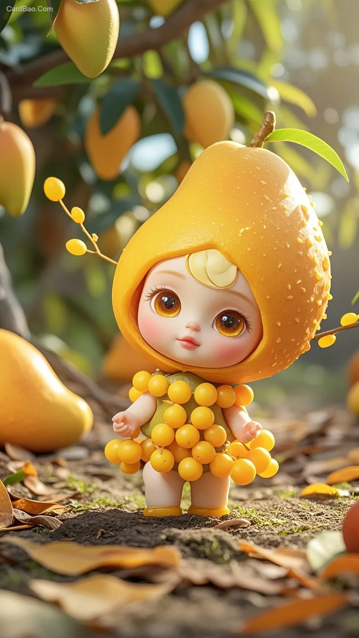 Close-up of a Mango Sprite, with large eyes like two translucent amber gems, sparkling with an innocent and curious glow, and eyelashes resembling delicate fringe that flutter slightly. Its round, plump face is a blend of yellow and pink, as tempting as a ripe mango. Playful hair accessories made of small, plump mangoes are strung together. It wears a tiny outfit meticulously pieced together from mango peels, with clear textures. Under the dappled light and shadows of a mango tree, surrounded by fallen leaves, it looks like a charming, lively little sprite that has just leaped out of a fairy tale, full of energy and cuteness.