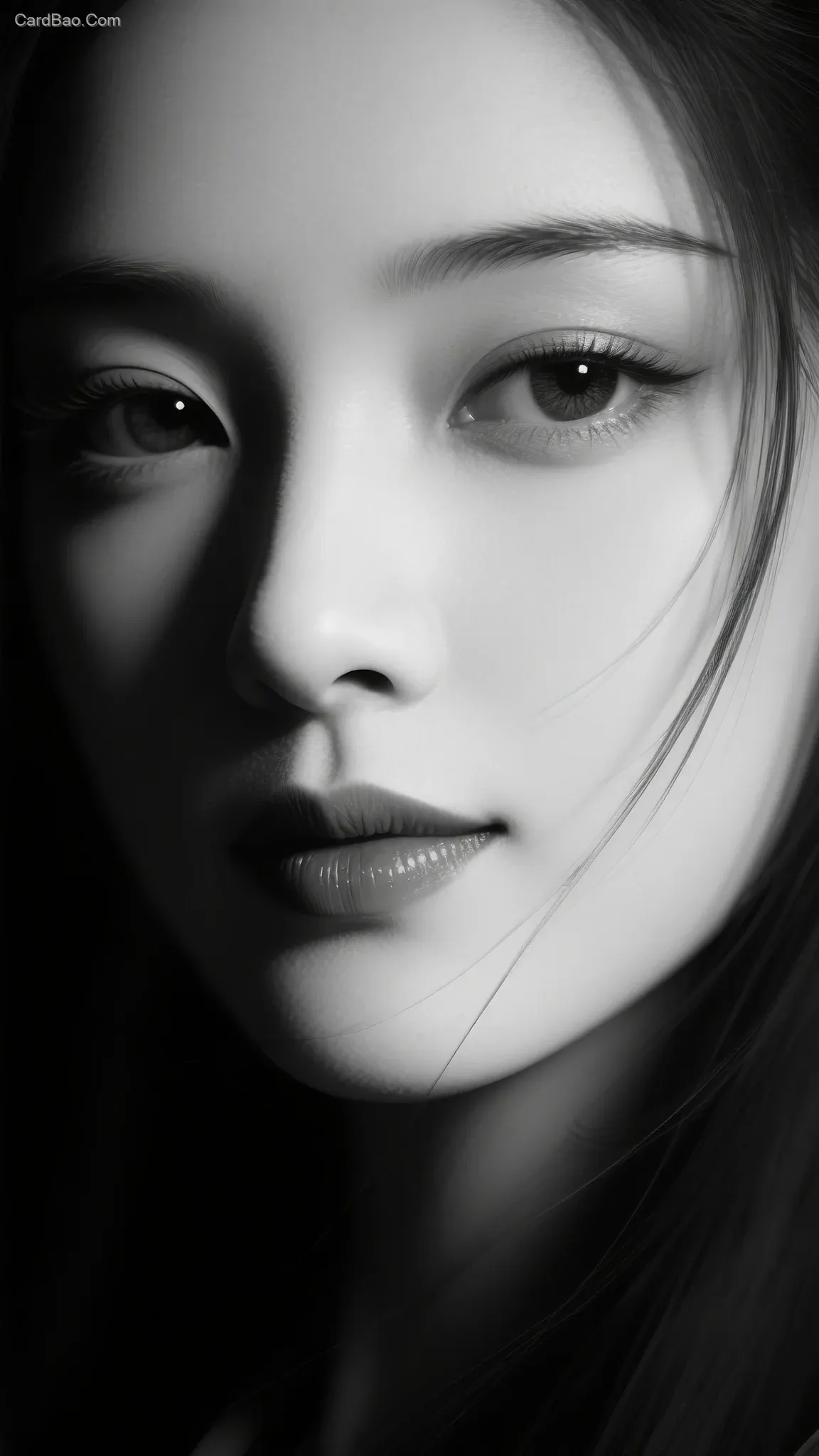 国风美人,面部特写,绝色容颜,黑白无杂色,哑光黑背景,朦胧的轮廓剪影,水汪汪的眼睛,嘴唇丰润,发丝灵动,压低光线,羞涩,微微一笑,细节超细腻,超精细CG,32K高清