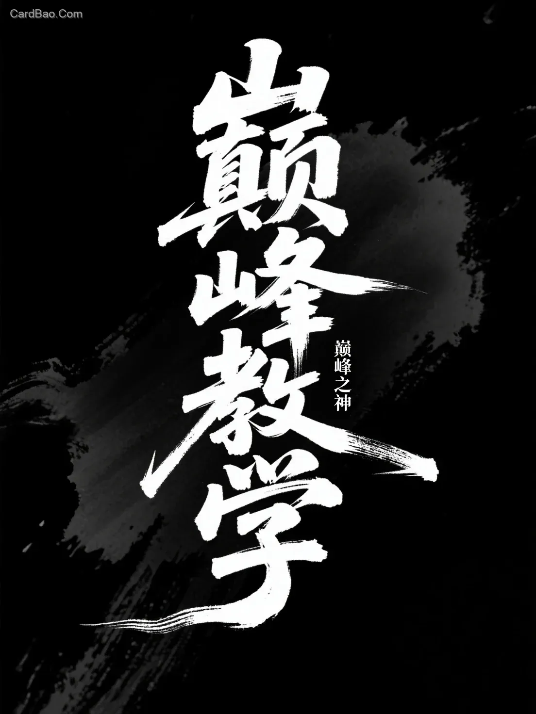"Peak Teaching" artistic font design, requiring a brush handwritten style with a strong artistic writing approach. Visually striking, with strokes enhanced by ink wash brush effects and cleverly extended design variations. Include a small seal "God of the Peak" beside the text. Black background with white characters.