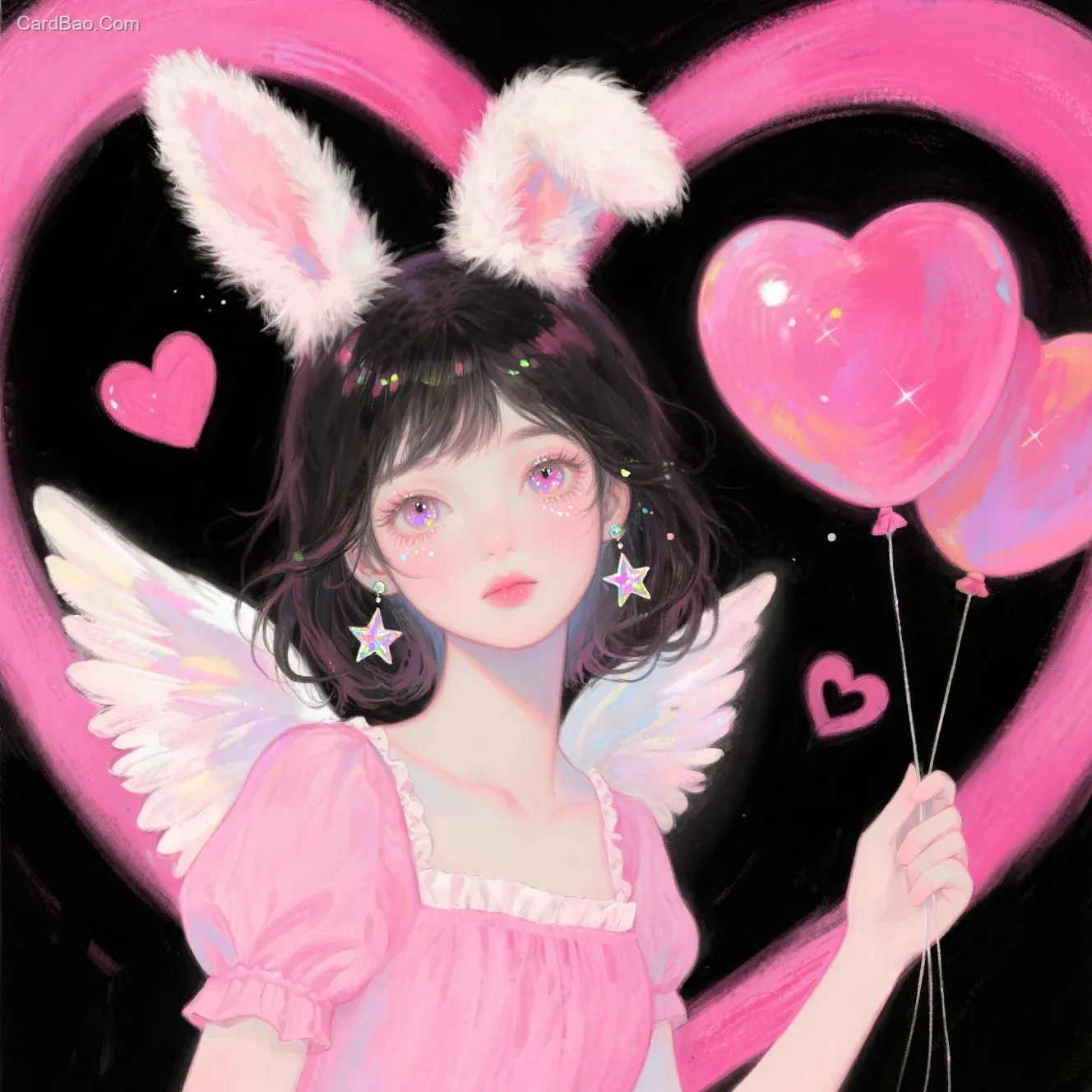 Character close-up, with the face occupying two-thirds of the frame. Bright, radiant, pure, world-weary, sophisticated, intellectual, cool, grand, aloof, mysterious, alluring, seductive. Stunning. Master-level composition, master-level color palette, master-level lighting. Illustration. Gouache texture. Atmospheric. Artwork. Acrylic paint, blending. Aesthetic, with thick oil painting brushstrokes, luxurious and breathtaking atmosphere, ultra-high-definition illustration, exquisite facial and eye close-up, stunning light and shadow effects, dreamy and hazy mood, hand-drawn illustration style. Eyes sparkling, irises glossy, with shimmering glitter around the eyes. Fluffy rabbit ears on the head, angel wings on the back. Double exposure covering the girl's face, speckled light and shadows on the face. Half-body close-up, pink dress, long hair, blowing bubbles from the mouth. Hair adorned with heart and star accessories. Background with black and pink hearts. Holding a heart-shaped balloon.