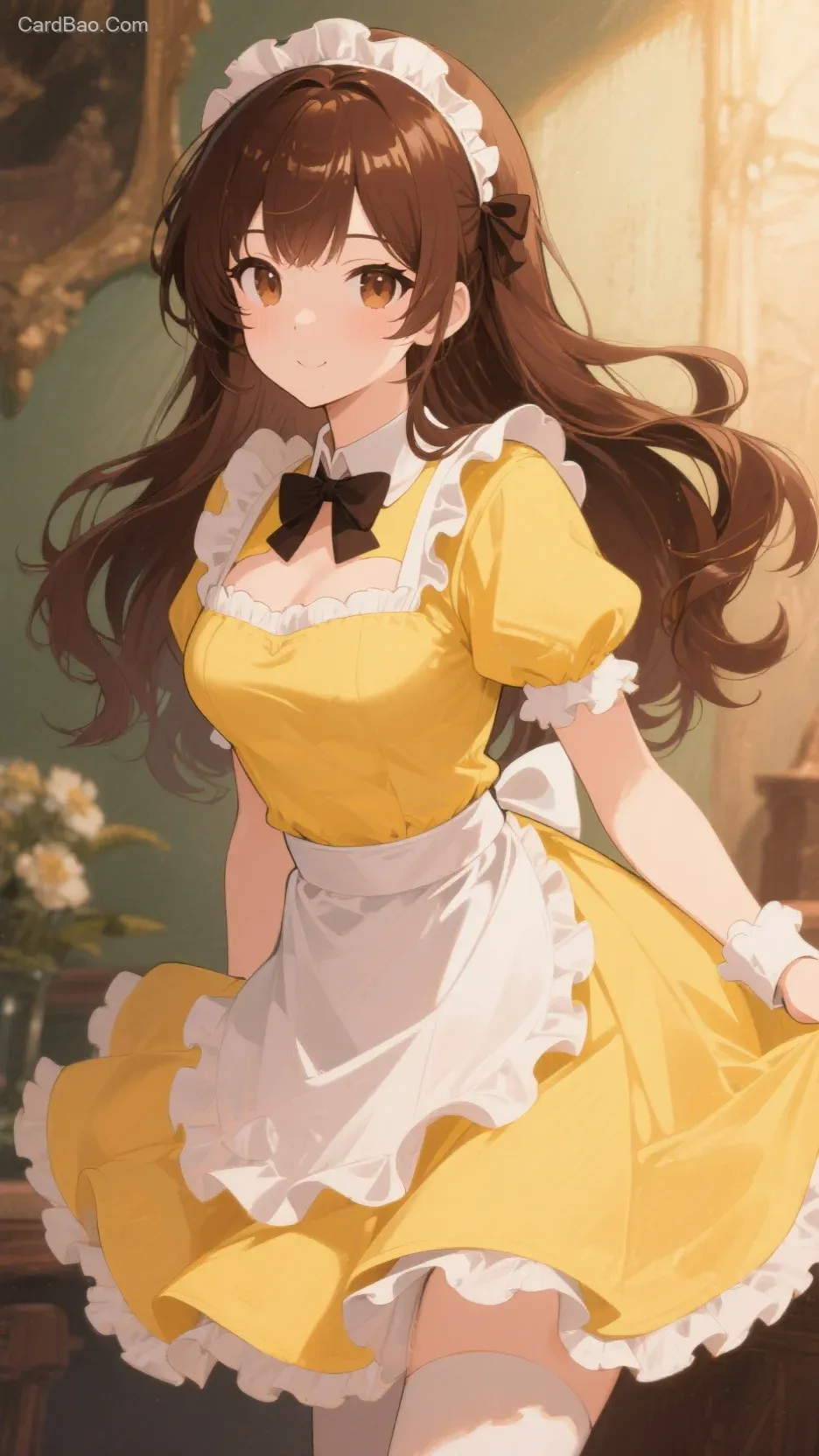 在复古暖色调的背景下,绘制一位美少女,她那如巧克力般丝滑的棕发闪耀着迷人光泽,整体画面营造出浓郁醇厚的油画质感,光影交织,构图精巧,弥漫着温暖而迷人的氛围,身穿黄色女仆装,二次元日本漫画风