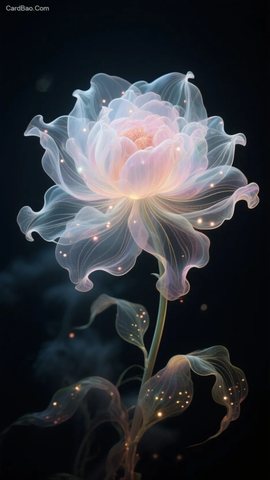 超现实主义,高清壁纸,简约,萨尔瓦多 达利,新工笔,创意摄影,高清摄影,由光影和线条组成的花朵的形态,没有实体,梦幻般的自然景观,彩色薄纱质感,像雾像云又像风,GIF,动画,逼真而又空灵,黑暗中盛开的花朵,层层叠叠的,薄如蝉翼,随风摇曳,风情万种,发光粒子,魔幻而浪漫,迷人的灯光,闪闪发光,细节描绘,透明的层次,一闪而过的细节,光与色,弥散渐变,