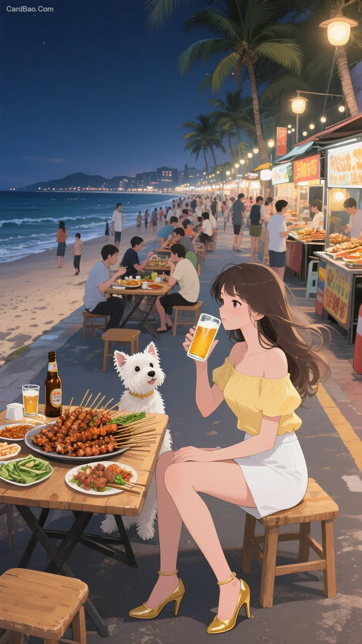 Anime illustration style, summer night in a coastal city, by the roadside of a seaside night market with various food stalls, each stall set up with low tables and stools along the road. Hand-drawn manga-style portrait of a girl, realistic human, beautiful young woman, fair and glowing skin, wind blowing through her long flowing hair partially obscuring her face in a hazy manner, wearing a light yellow off-shoulder top, white miniskirt, and golden high heels. Close-up shot, 32K ultra-high definition quality, extremely high detail precision. The girl is sitting and drinking an ice-cold beer, with a large plate of grilled skewers on the table—both meat and vegetable options—and a glass bottle of craft beer. Beside her, a white Schnauzer looks at her eagerly. The girl drinks while gazing at the ocean, seated facing the sea. Around her, bustling passersby—some eating, some looking at the food, others watching the ocean. A vast stretch of sandy beach and sea, numerous ambient lights, and many coconut trees create a calm, soothing atmosphere, conveying a sense of relaxed comfort after a busy day.