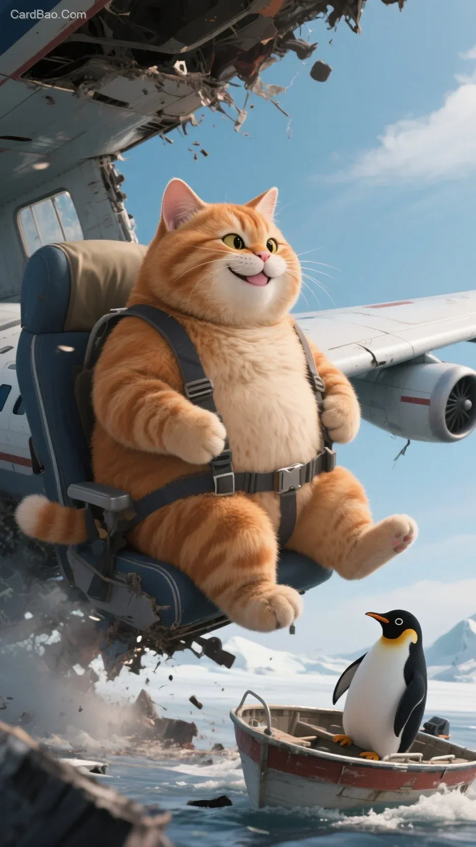 Realistic style, panoramic view, full body, side profile, an anthropomorphic chubby ginger cat (with a smiling face) is sitting on an airplane when suddenly the plane crashes. Only he survives, and is later rescued by a small penguin sitting in a boat nearby.