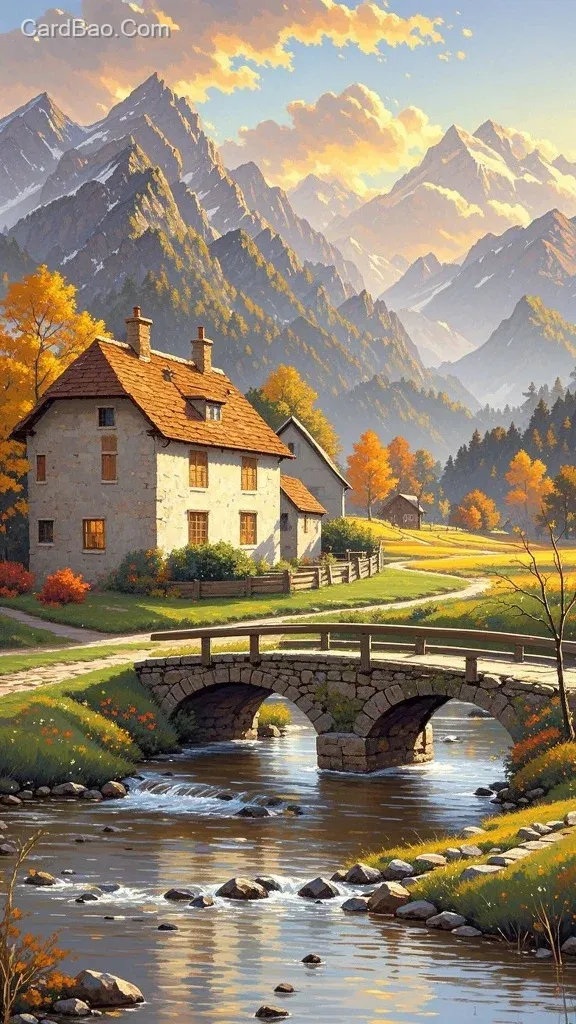 Realistic oil painting style, panoramic view. The scene depicts a rural countryside landscape with a cottage (blending brown, gray, and yellow, rustic and cozy), trees (blending yellow, orange, and green, autumn colors), a stream (blending blue, white, and brown, flowing gently), a stone bridge (blending gray and brown, simple and rustic), a path (blending brown and yellow, winding naturally), and mountains (blending purple, orange, and yellow, layered and majestic). The rich and warm color palette (blending brown, gray, yellow, orange, green, blue, white, and purple) creates a unique, tranquil, and leisurely rural countryside atmosphere.