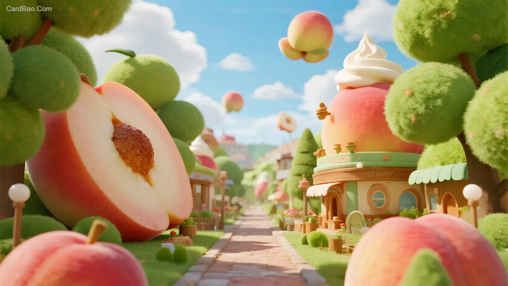 由桃子构成的奇幻城市,建筑物、街道乃至地面都是由大而多汁的桃子组成。整个城市景观色彩鲜艳,空气中弥漫着绿色桃子的甜美香气。天空中漂浮着奶油般的云朵,一些建筑顶部还装饰着打发奶油。整个场景充满了童趣和梦幻,仿佛置身于一个甜蜜的童话世界。整体毛茸茸的。