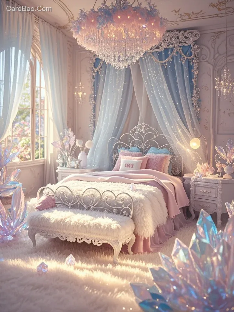 Fluffy texture, long-haired material, plush fabric, 3D rendering, my dream princess room, fairy tale princess bed, white sheets and white tulle, shell-like texture, dreamy light pink, surrounded by many crystal flowers, sparkling, transparent light circles floating all around, super detailed, lighting effects, fairyland, romantic, dreamy, 8K HD wallpaper.