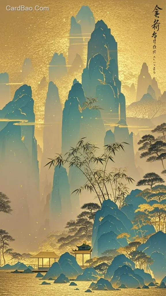 "Neo-Chinese ink illustration, gold sand splatter texture, gold foil relief texture, atomized hazy brushstrokes, bamboo forest silhouette with a balance of solid and void, Zen-inspired blank space composition, Song Dynasty courtyard painting structure, gradient blue-green landscape color palette, soft light defocus effect, imitation antique silk paper aging, Wang Ximeng-style ornate details, Bada Shanren's minimalist artistic conception, ukiyo-e print lines, hazy light golden tone, aerial perspective layering."