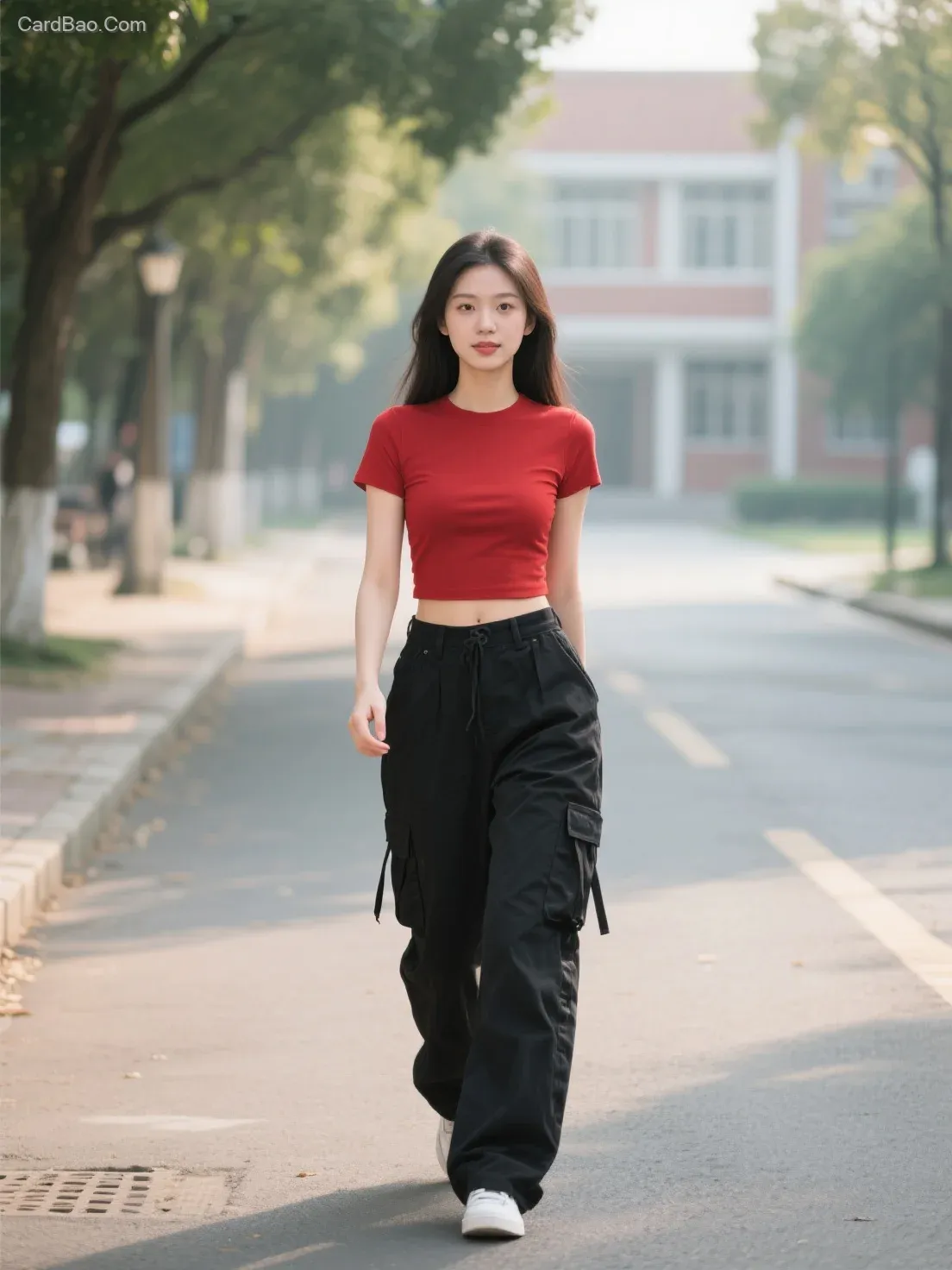 A stunning beauty, in the morning, on the road, encounters a college girl with a tall and slender figure. She is wearing black loose cargo pants and a tight red T-shirt, with a delicate and pretty face. Full-body shot, high definition.