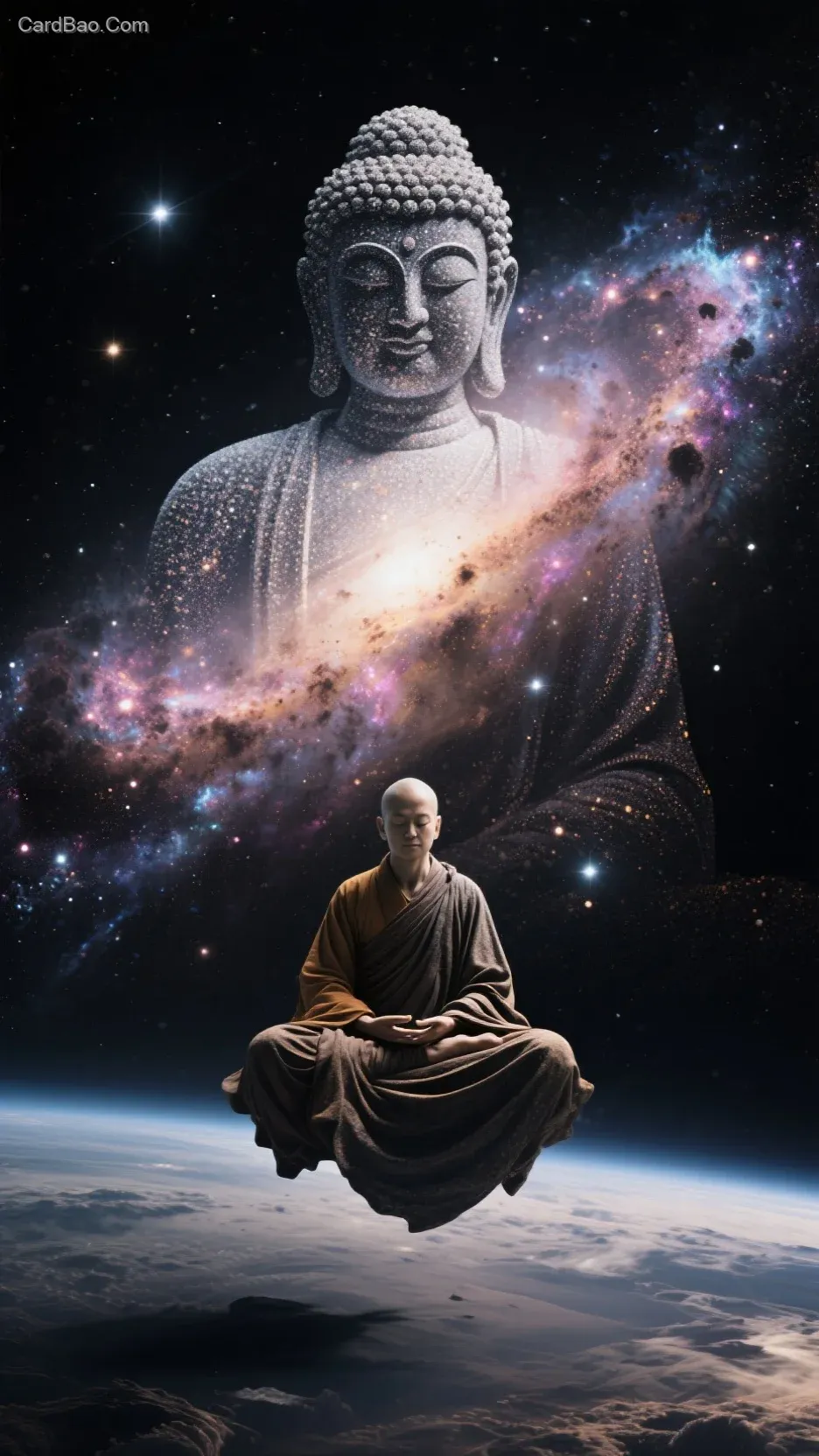 Surrealist style, a high monk meditates and floats in outer space, facing a colossal Buddha formed by the Milky Way and nebulae. Featuring a grainy texture, large color washes, and an abstract artistic composition, the scene evokes a dreamy and ethereal atmosphere. Set against a black interstellar cosmic background, the close-up perspective highlights the texture of the robes, contrasting brilliant starlight with the deep void. Dynamic lighting effects enhance the three-dimensional feel, while a high-quality texture renders cosmic dust. This creative fusion blends religious and celestial elements.