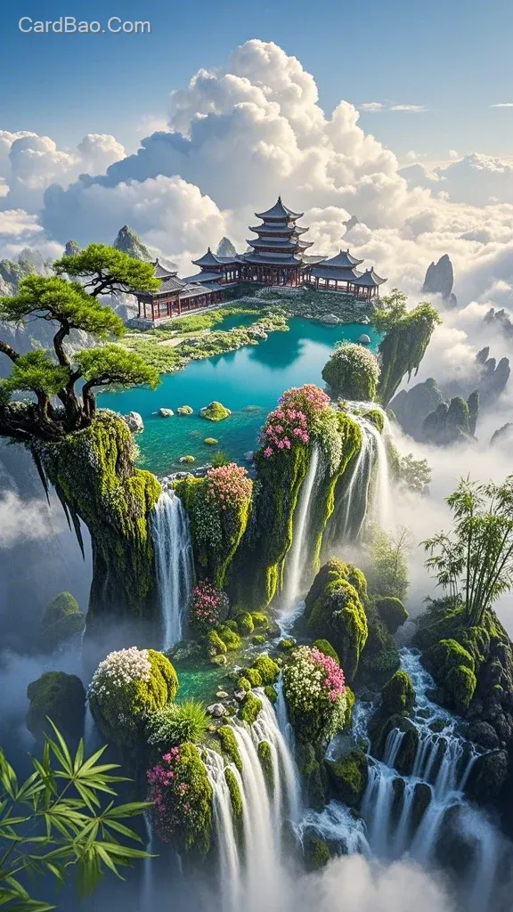 图片生成信息:云朵中的石头长着青苔和五颜六色的花朵,云朵上有一座道观和一个湖,瀑布流到下面的巨大湖泊,壮观、震撼的效果,道观周围有松柏和竹林,高清晰度航拍照片呈现出细腻的纹理和自然的色彩,高分辨率的细节让人第一眼就有身临其境的感觉。