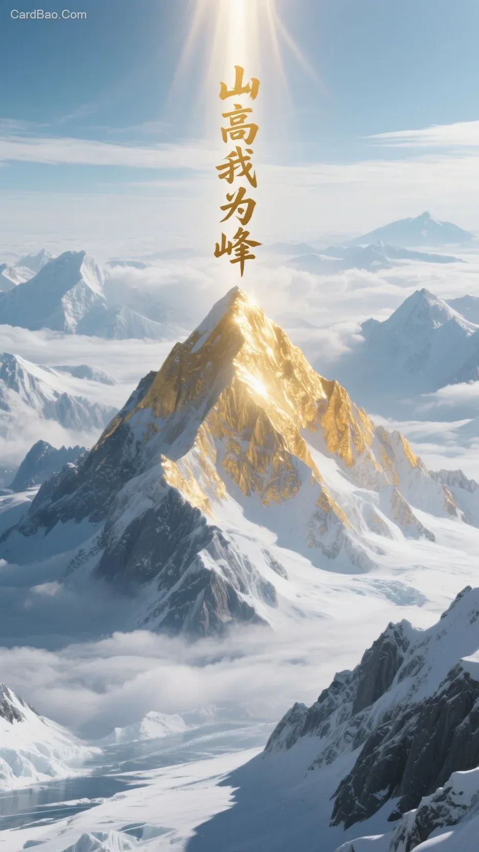 At the summit of the snow-covered plateau, the majestic snow-capped mountain peaks are draped in a brilliant golden glow, towering high above the vast glaciers. Amidst the rushing clouds, the sun's rays pierce through the azure sky, casting a sacred light that cascades for thousands of miles. Atop the golden mountain peak stands the inscription: "The mountain is high, and I am the peak," rendered in bold, powerful, 3D strokes.