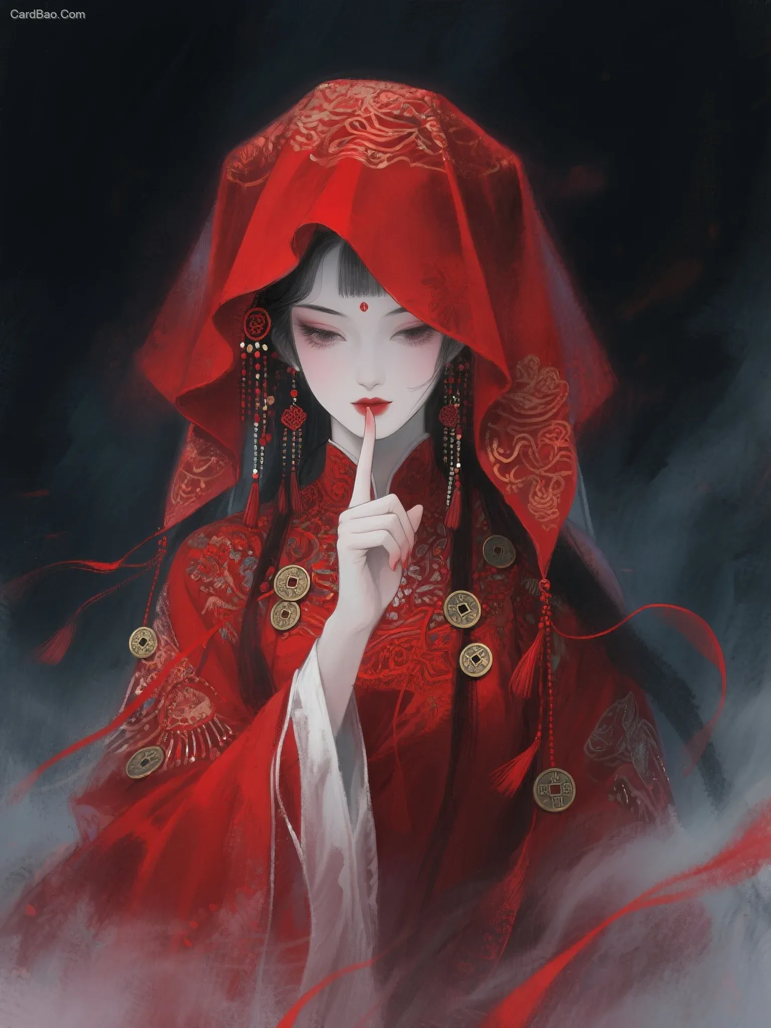 Blurred dark background, dim and cold atmosphere. A bride in red wedding attire, her head covered with a red veil, raising a finger to her lips. Eerie folkloric style, red threads, small copper coins, a sense of fluidity, mysterious, full of mood, hazy mist, cool color tones. Intricate draping, strong contrast between light and shadow in the composition.