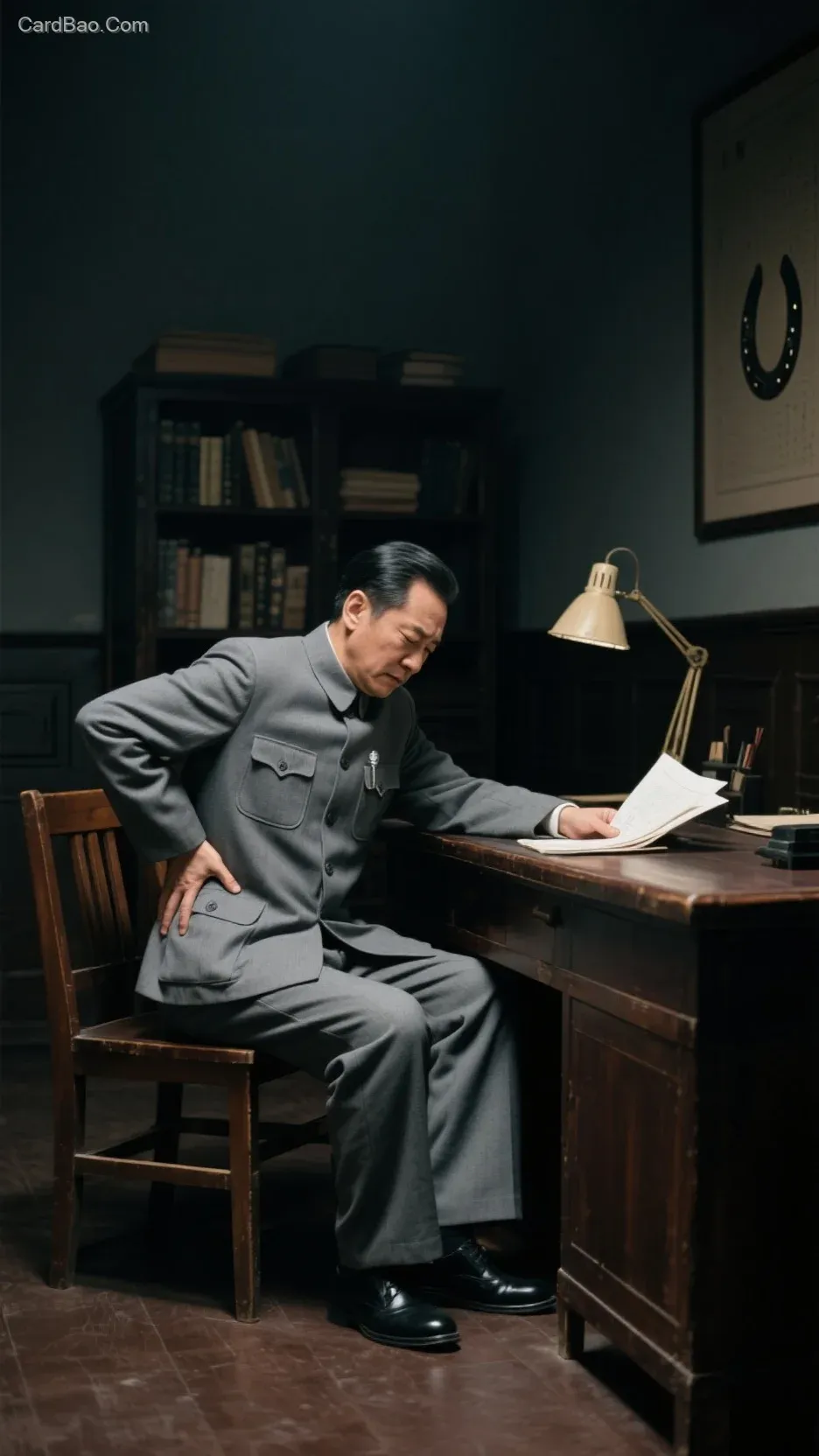 浑暗房间,一张办公桌,一个书柜,一盏马蹄灯。一位40多岁,穿一身灰色中山装,灰长裤,黑皮鞋,坐在木椅上办公桌旁,一手捂着病痛的腰部,一手仍在批阅文件。全景,全身,高清,年代感。