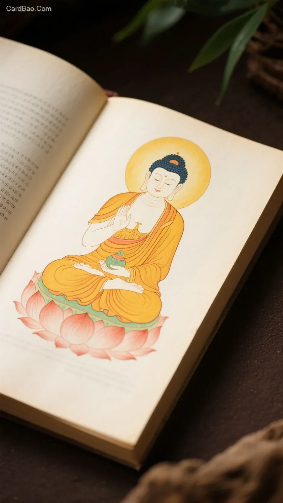 In the image, there is a book with a depiction of Amitabha Buddha on it.
