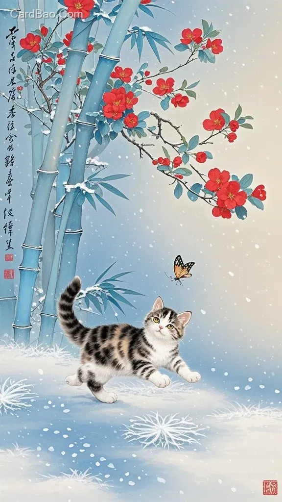 Chinese style, fine brushwork, kitten pouncing on a butterfly, bamboo, crabapple flowers, snow-covered ground, blue and white color palette, ethereal and clear atmosphere.