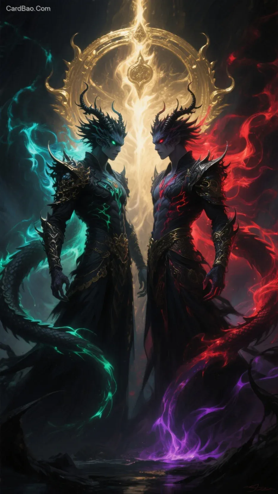 神明世界,暗黑系,善恶仙魔,龙族双子,前后站位,双子魔化形态,真人写实,现实主义,能量光罩,油画写实风,黑金红蓝绿紫色,光效光暗分明,神圣与狂野形成鲜明对比。