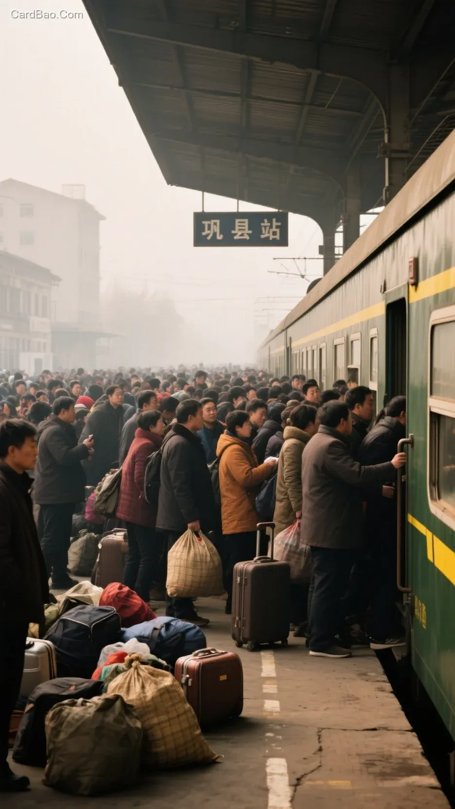 一个拥挤繁忙的火车站台,大量人群密集聚集,中国人们身着深浅不一的秋冬衣物,色彩丰富多样,手中或肩上携带编织袋、行李箱等各式行李,部分行李堆放在地面,呈现出杂乱却真实的出行景象。画面右侧,一列绿皮火车静静停靠,车身带有黄色装饰线条,车厢门口人群簇拥,人们正排队挤向车厢,仿佛在争分夺秒地寻找自己的位置。站台上方的顶棚结构清晰可见,招牌上写着大字蓝色(巩县站),远处的建筑物在雾气的笼罩下若隐若现,为整个场景增添了一层朦胧的质感,生动营造出火车站特有的喧嚣氛围,淋漓尽致地展现出人们出行时的急切与忙碌,传递出浓厚的生活气息与年代感。
