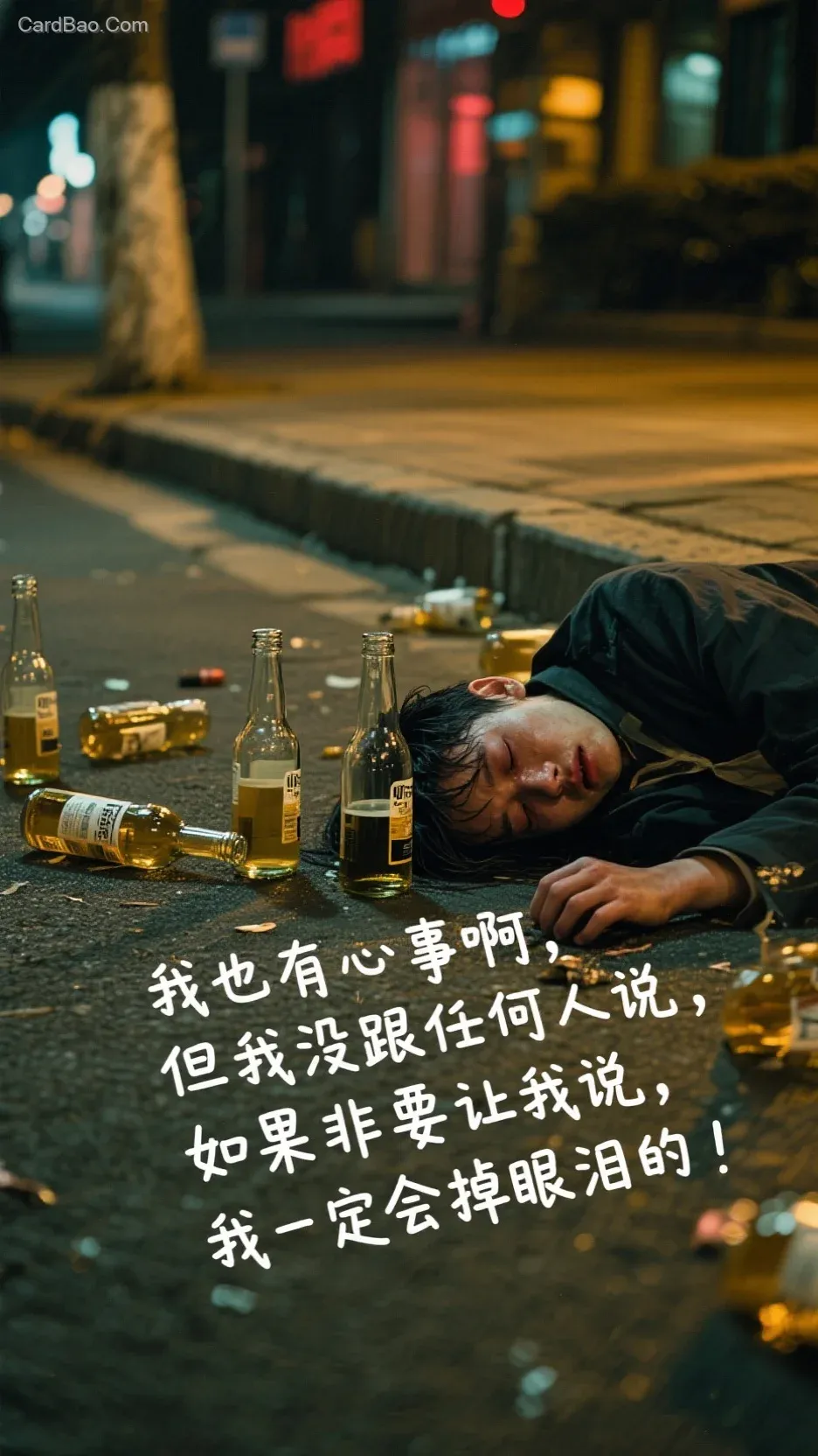 我失恋后,喝醉了,醉倒在街头了,散落几个酒瓶,旁边写着几行白色小字“我也有心事啊,但我没跟任何人说,因为我知道,如果非要让我说,我一定会掉眼泪的!“