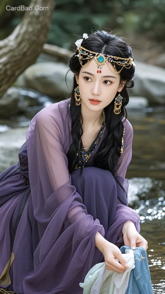 An ancient oriental woman in a purple-black gauze dress, with her sleeves rolled up, washing clothes by a stream in the forest, her loose hair adorned with a Western-style gilded hair chain and a gemstone forehead ornament.