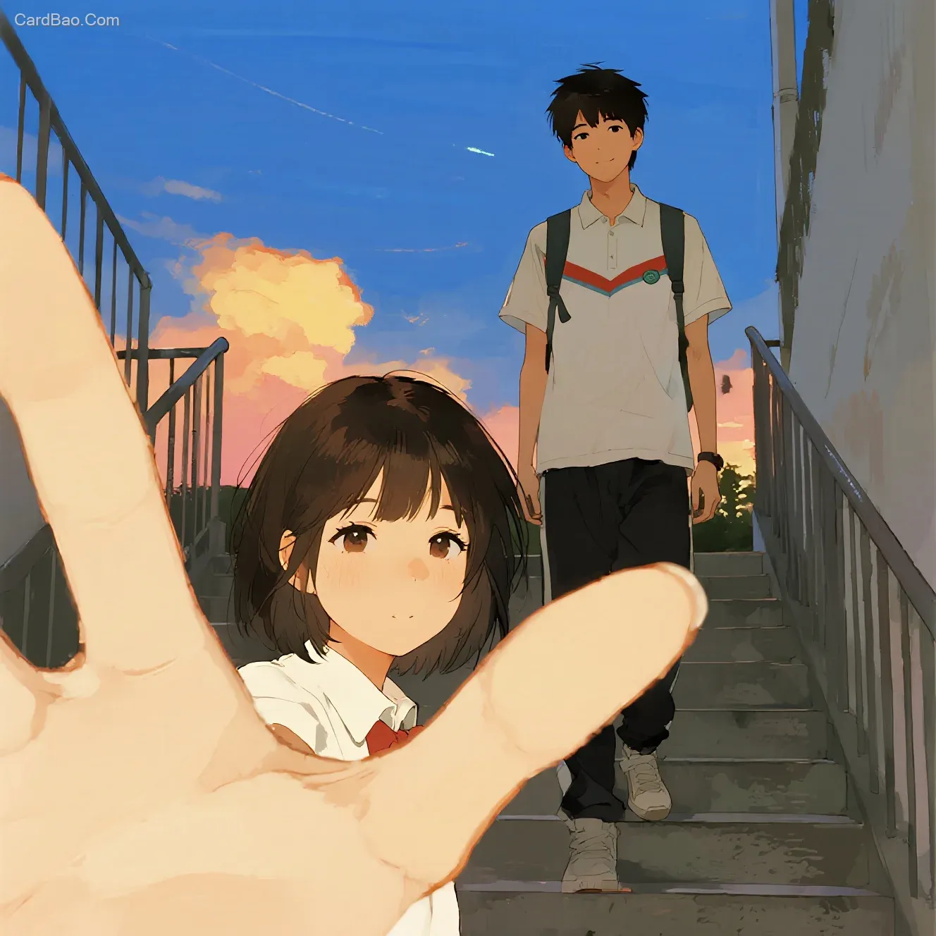 Blue background, sunset glow, color blending, delicate brushstrokes, ink wash rendering, foreground occlusion, on school stairs, a boy above and a girl below, taking a selfie toward the camera, posing.