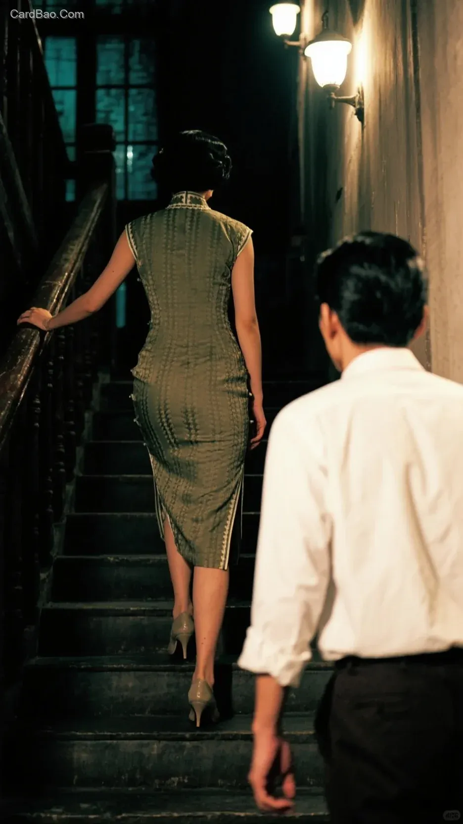 晚上,楼梯上,灯光昏暗。女人上楼梯,男人下楼梯,相向擦肩而过,男人转身扭头看女人的背影,男的白色衬衫,领带,头发油亮。女的穿着旗袍,高跟鞋,梨形身材,小腿修长笔直。王家卫花样年华风格