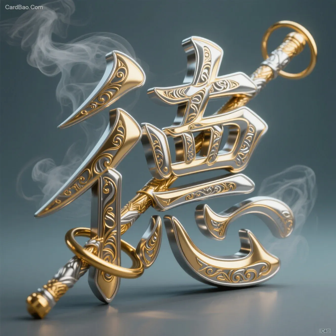 由金属钛合金制成的金箍棒元素组成的中文正楷书法字体“德”,文字上雕刻有精致花纹,金属感,真实感十足,立体饱满的笔画,笔画。借立体穿插,显得呕吐,涂抹不均的效果,具有金属流动的金色和银色笔触,有厚有薄笔画拉比纹理浅析,阴影。烟雾点缀。纯色背景,用途艺术设计图,3D立体高清风格,特写镜头,唯美氛围,8k画质。