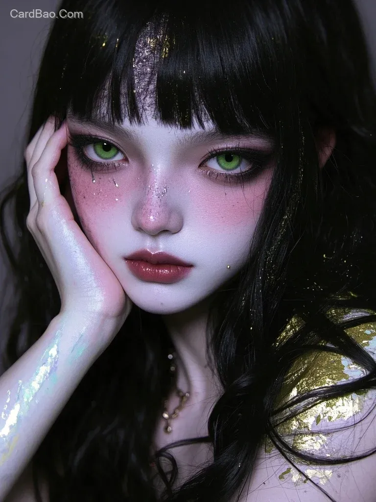 诡异唯美,绿色的瞳孔,带着不健康泛白的肌肤的女孩。女性女孩,末世感,泛光,朦胧的。珠光,反射,暗黑童话,芭比,暗黑版芭比,黑色长发卷发长发,极端构图,怪诞美学,梦核,丧,高冷,冷漠,傲慢,磨砂肌理绘画,金箔岩彩,黑粉岩彩绘画,笔触感,肌理感,侧身手撑着头