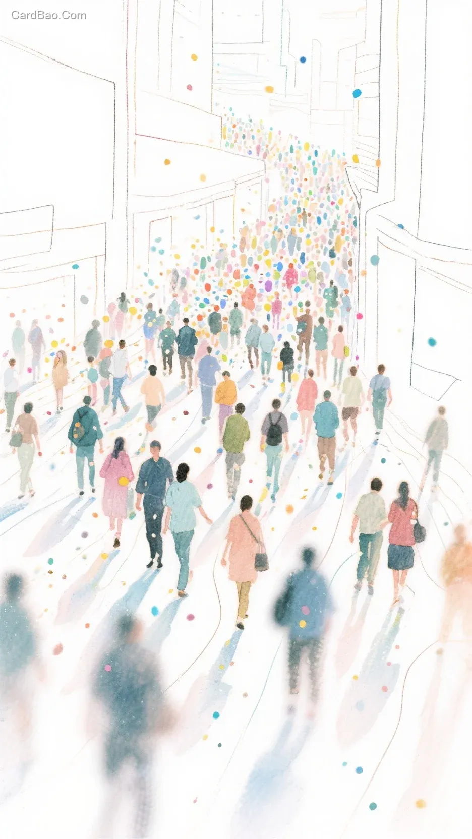 Using watercolor lines to outline the dynamic contours of the crowd, the colors are blurred and interwoven in a stream-of-consciousness style, conveying the hustle and bustle of the city. A minimalist approach simplifies the forms of the crowd, highlighting their sense of movement. Particle pointillism transforms into emotional light spots within the crowd, flickering and transmitting, presenting the concept of "Urban Emotions in Motion: Watercolor Lines of Crowd Dynamics + Stream-of-Consciousness Color Blurring + Minimalist Crowd Movement + Flickering Emotional Light Spots of Particle Pointillism," showcasing the vitality and emotions within urban human life.
