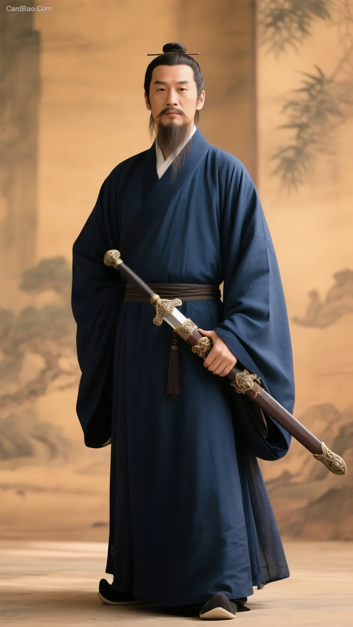 真实摄影风格,唐代诗人李白全身正面像,留着胡须,深蓝色道袍,宽袍大袖,手拿宝剑,剑在剑鞘中,中国风背景,柔和光影