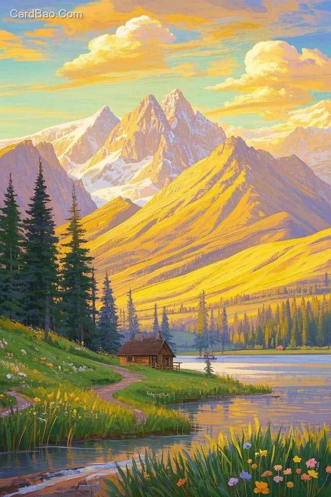 油画,远景白云堆积的天空露出一缕霞光,中间是金色的山,层叠耸立,朦胧唯美。中景是苍翠的森林,与远景交触。近景是小河,岸边水草,岸上是开满鲜花的草地,小路,小木屋。