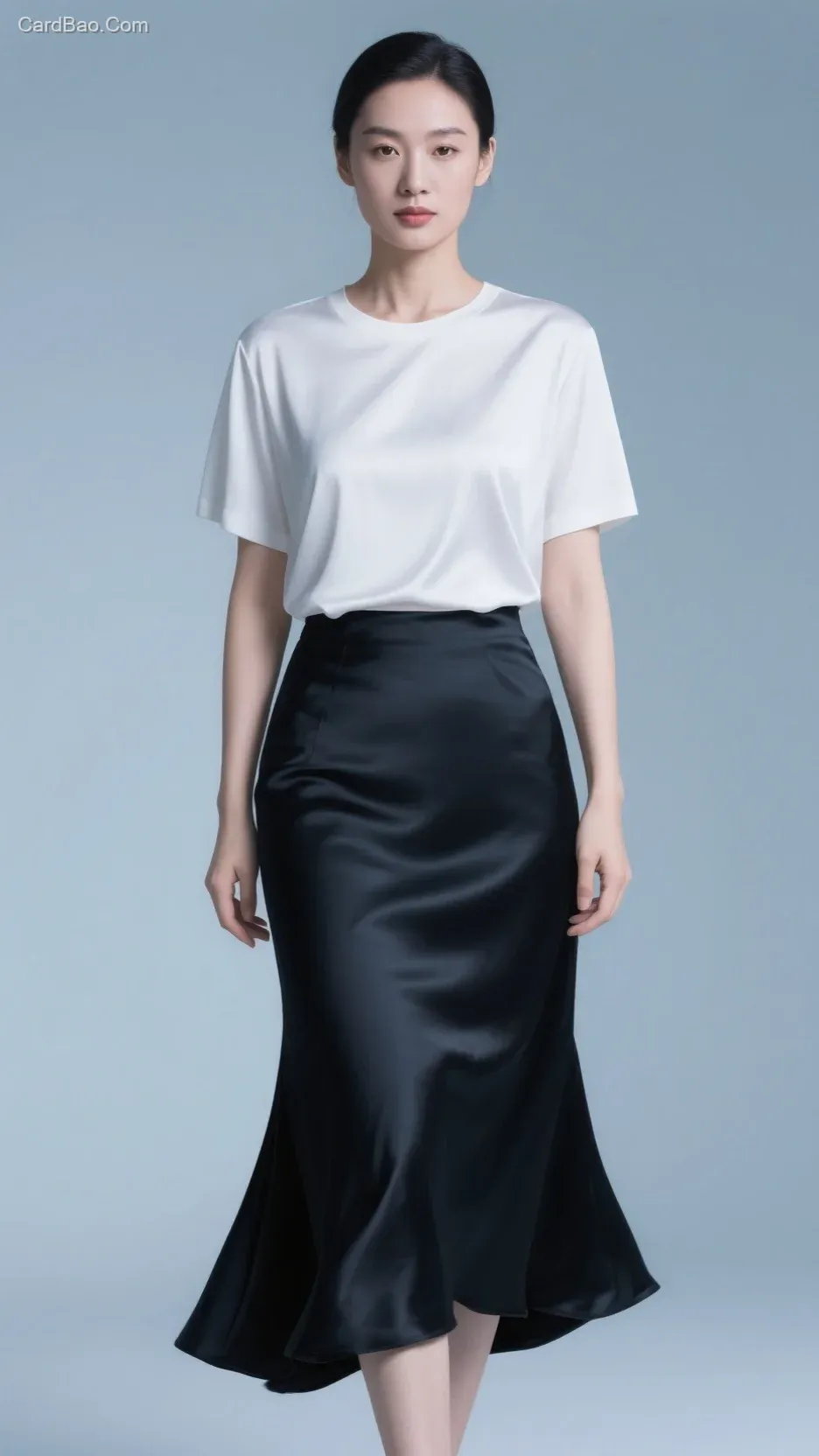 ✨ Material details: Contrasting flowing luster of dual-toned silk—the black skirt reflects a cool, deep gray-blue sheen, while the white T-shirt emits a warm, soft glow.