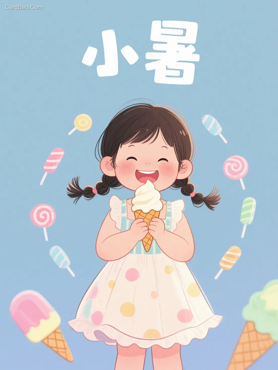 小暑的字显示在图片上,一个女孩吃着冰淇淋,超级满足幸福,纯色的背景,女孩身边围绕的都是糖果雪糕,女孩扎着两个小辫,插画风格
