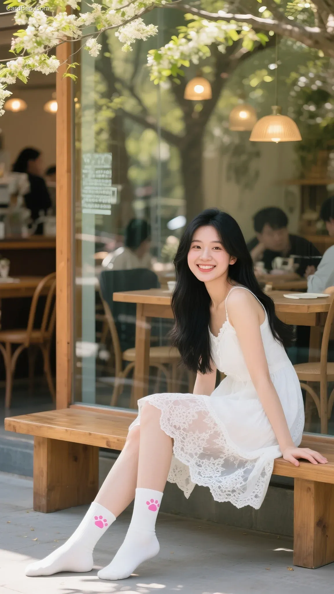 A young woman with long black hair cascading over her shoulders, wearing a lace dress and white mid-calf socks adorned with pink paw prints, sits on a wooden bench looking back with a gentle smile. The warm glow from a shop with glass doors and windows illuminates the scene, where silhouettes of people and furniture are visible inside. The spring sunlight filters through the tree branches, casting dappled light spots around.