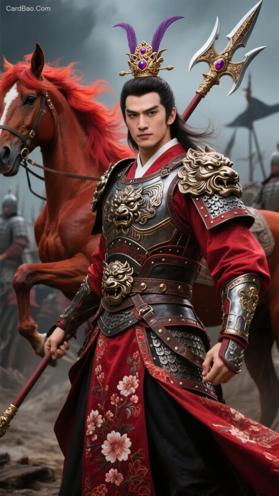 3. Attire and Accessories: Adorned with an ornate triple-pronged purple-gold crown, inlaid with precious gems that catch and reflect light. Dressed in a vibrant red Xichuan cotton robe embroidered with a hundred flowers, featuring intricate patterns and a soft, lustrous texture. Over this, he wears a beast-faced, interlocking chainmail armor with a strong metallic sheen, the beast motifs carved with lifelike detail. At his waist, a lion-mane belt combines metal fastenings with leather, rich in intricate craftsmanship.