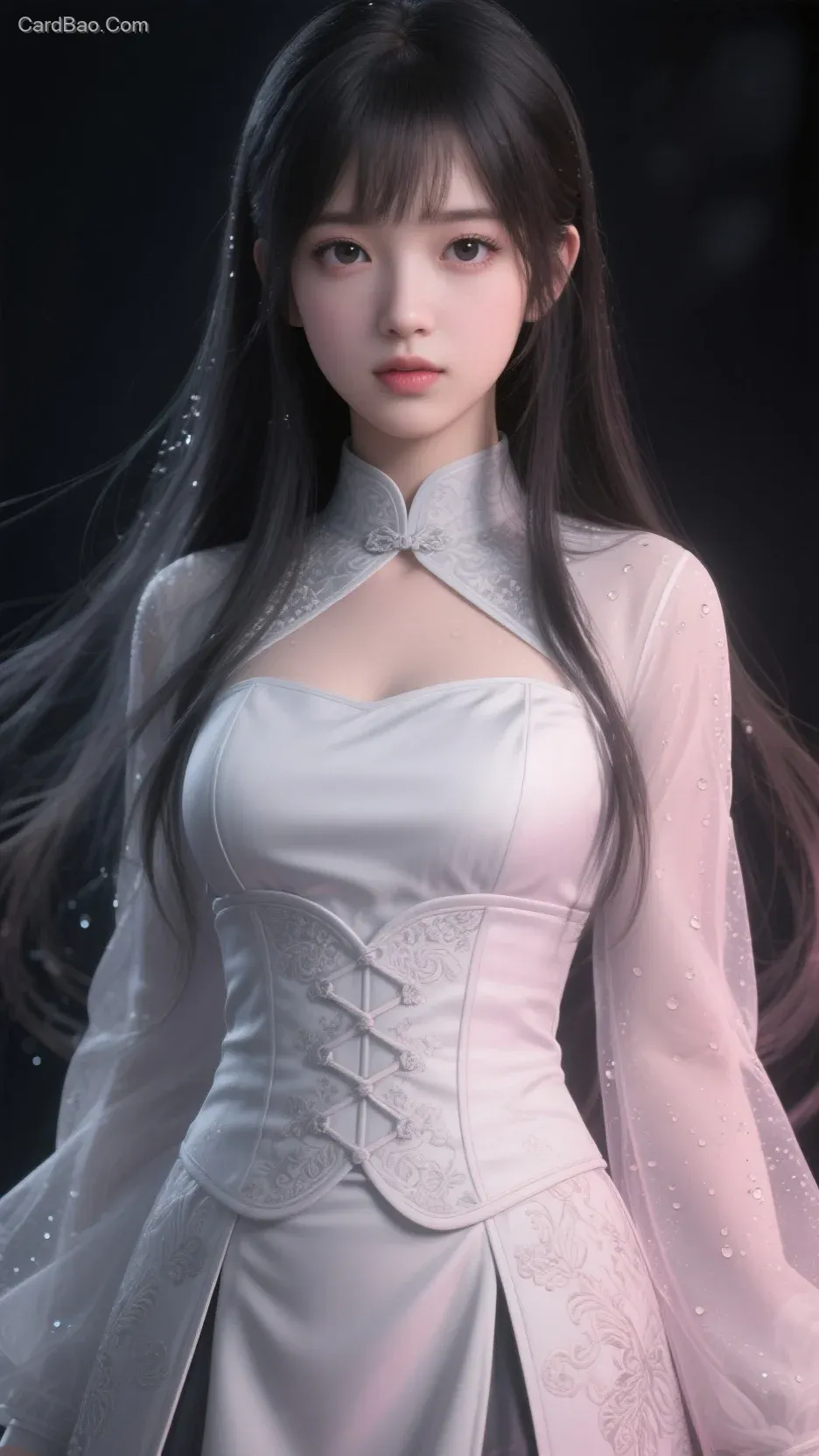Professional terms: Single strand diameter 0.05mm with slightly tapered ends, multi-layered gradient texture on black irises, V-Ray rendered skin, 3D high-precision modeling and rendering, realistic imitation, one-to-one reproduction, body partially obscured by darkness, face illuminated by a soft gradient of pink-gray light, magical, dreamy, Cosplay, classic styling, role-playing, macro lens, ultra-high-definition, ultra-detailed image, realistic skin texture, ultimate detail, fair and tender skin, smooth and delicate skin, flowing hair, intricately detailed strands, serene and elegant, skin adorned with water droplets, atmospheric ambiance, 32K resolution, hyper-realistic skin texture, super detailed, high level of detail, attention to detail, contrast between light and shadow, ultimate detail, master-level lighting and shadow, sense of depth, three-dimensionality.