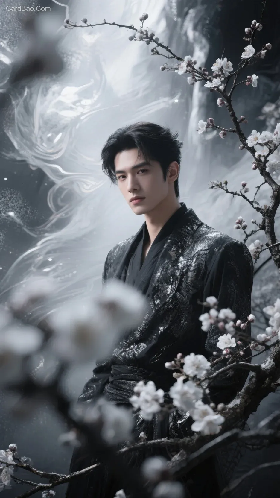 帮我生成图片:暗黑、银灰、白调,抽hdr肌理与抽象光影交织出朦胧叙事,爱多梦风格,hdr抽象,adm模糊,梅骨绝世容颜在非常规构图中透出冷艳妩媚,胶片颗粒为超现实场景蒙上印象派薄纱。美男。图片风格为写真,比例 9:16。