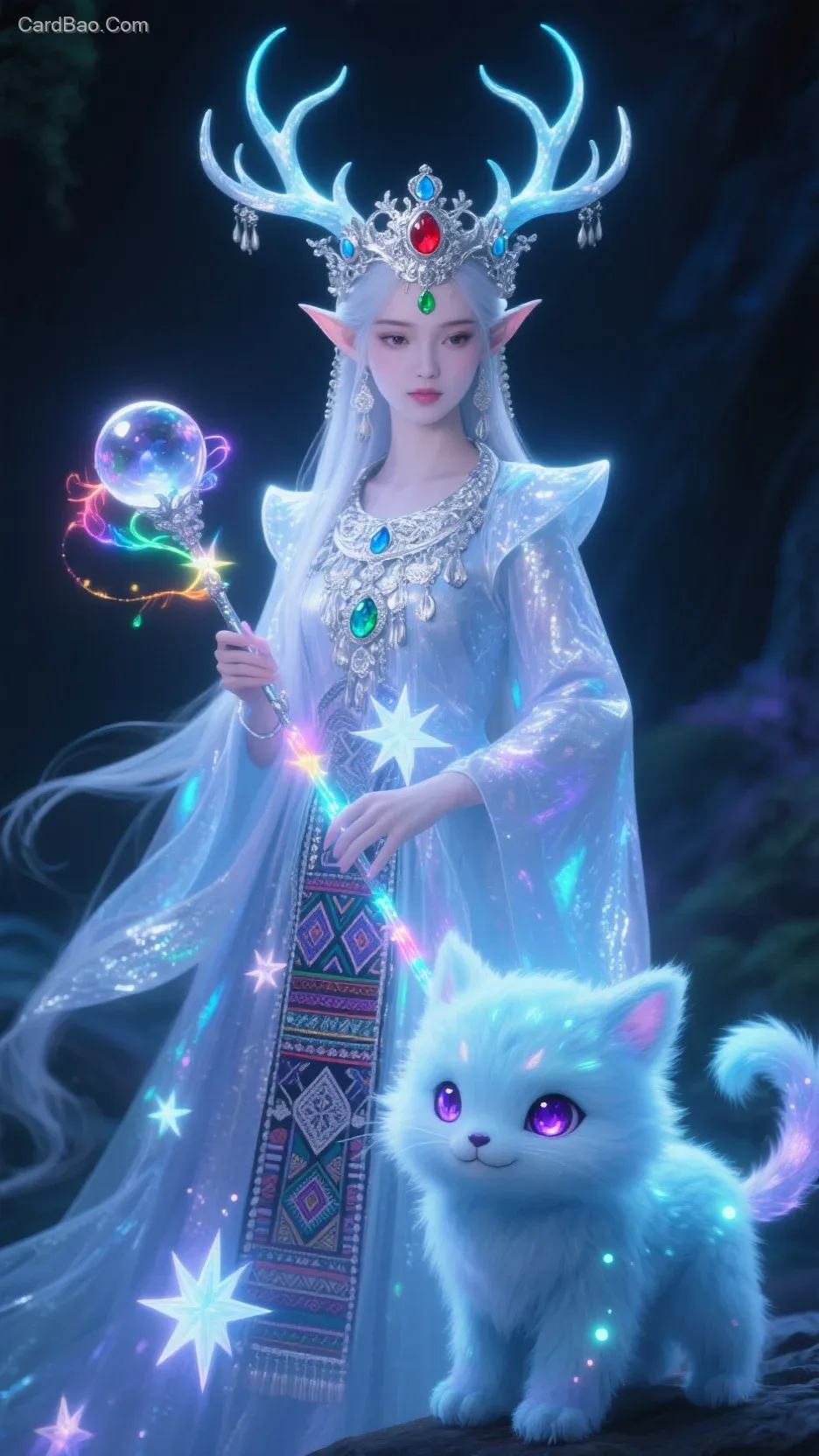 A Miao elf princess. She wears a glowing robe, its fabric seemingly woven from starlight, shimmering with a dreamlike radiance. The robe is embroidered with traditional Miao patterns, such as butterfly and bird motifs, which appear vivid and lifelike under the illumination. On her head, she has a pair of distinctive antlers, elegantly shaped and intricately branched, covered with a faint, mystical glow that seems to hold ancient power. The antlers are adorned with numerous delicate silver ornaments that sway gently in the breeze, producing a soft, melodious chime. Her silver crown is exceptionally ornate, inlaid with various colored gemstones—red like fire, blue like the sea, and green like jade. These gems refract light, casting a dazzling, multicolored brilliance. The edges of the crown are adorned with strings of tiny silver bells, echoing the silver ornaments on her antlers, creating a dynamic and magnificent display.