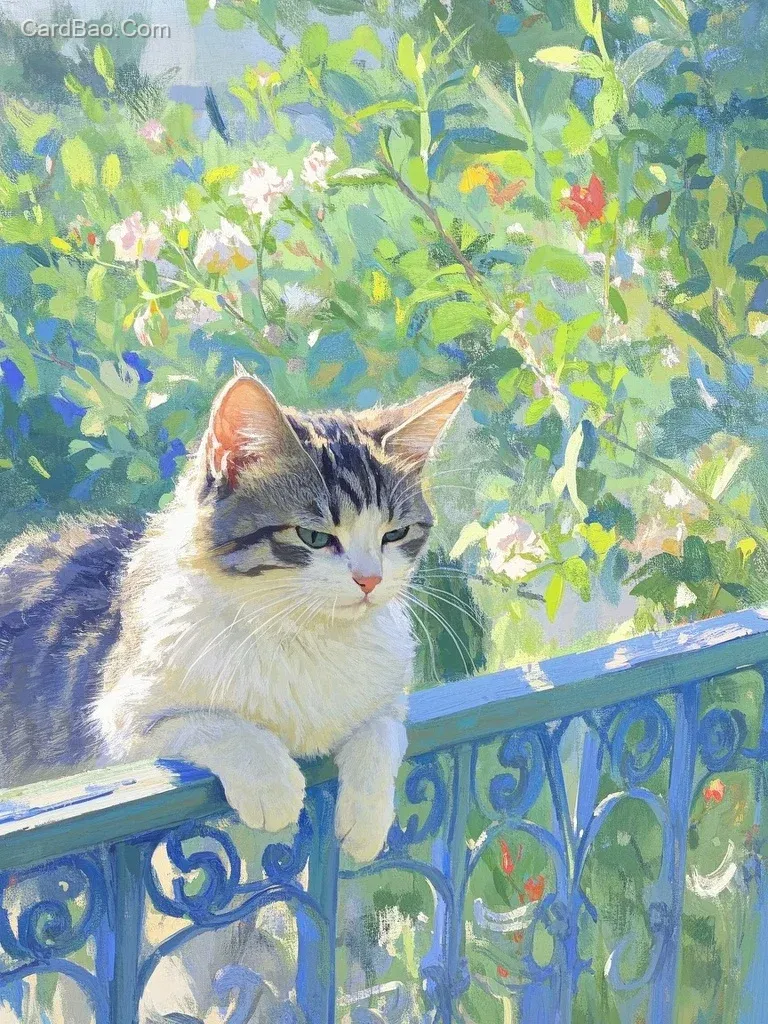 油画风格,淡涂,小猫不屑眼神,工笔画,画风细腻,笔触细腻,质感,肌理,构图复杂,对称感,曲线构图,光影绝美