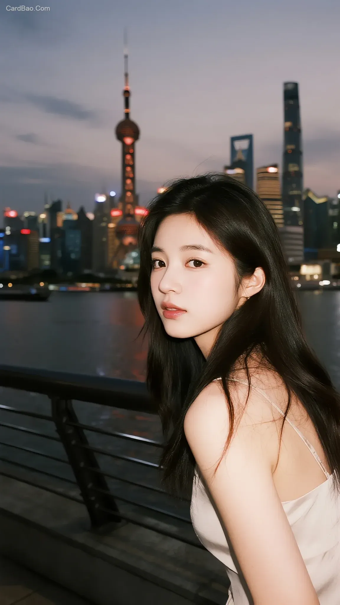In the corridor of the Pudong Art Museum, a beautiful girl with large double-lidded eyes, long hair, and exquisite makeup leans naturally against the railing. Her gaze is directed toward the left front. The background features the night view across the Huangpu River, including the river itself, the Oriental Pearl Tower, and various skyscrapers. The scene is set at dusk, with the city lights beginning to shine brilliantly.