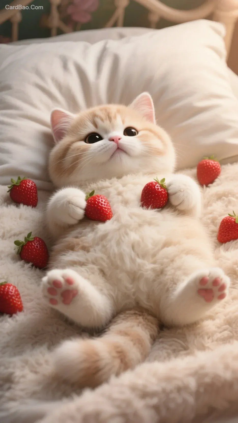 一只非常可爱的萌萌的圆滚滚胖乎乎毛茸茸的小猫咪幼崽,仰卧在毛茸茸的床上,四个爪爪上各放了一个草莓,可爱,猫咪表情呆萌