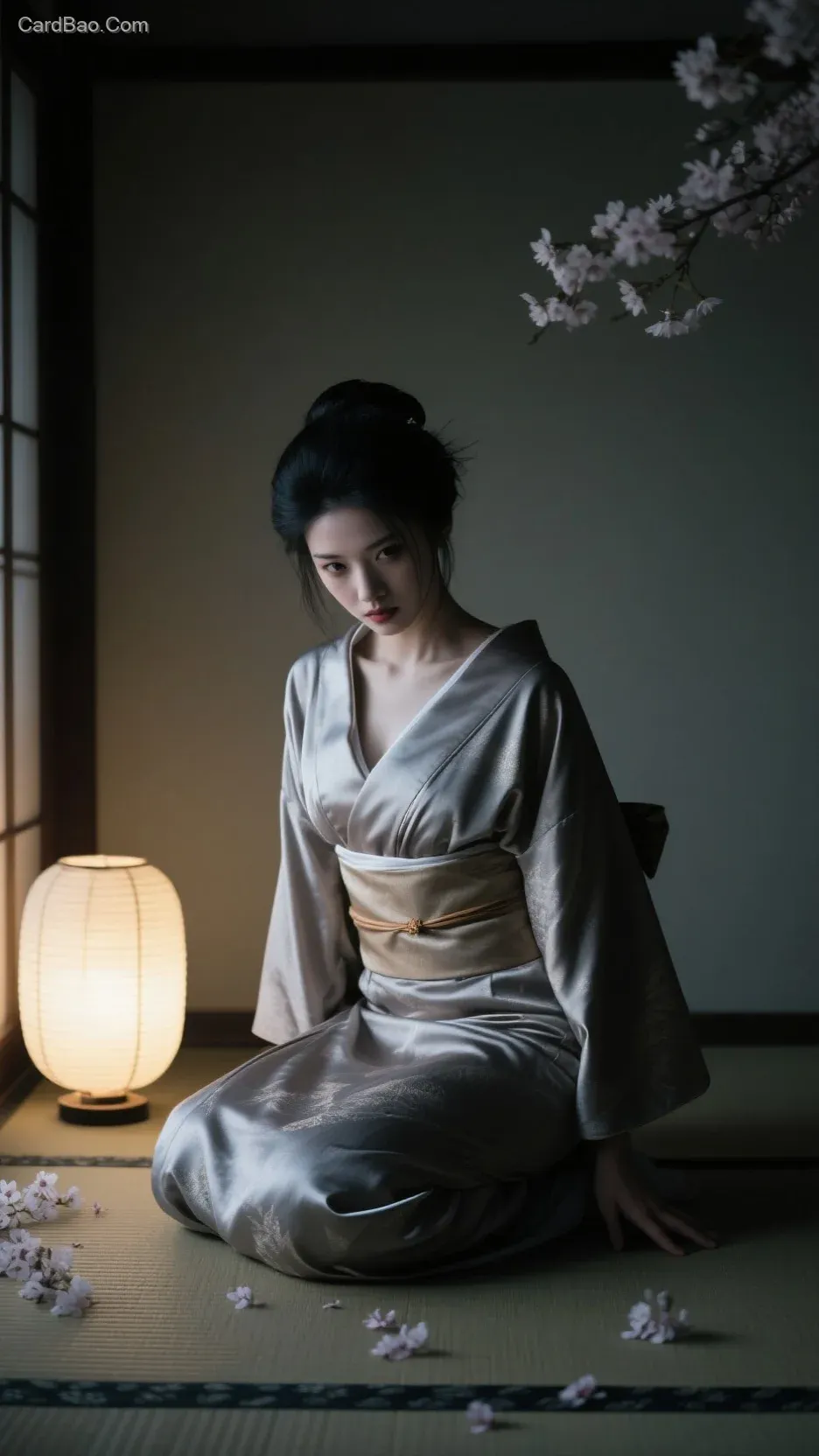 性感的日本古风美女,身着丝绸和服,腰束紧致缎带,勾勒出完美曲线。她跪坐在幽暗的榻榻米房间,,眼神压抑火热。背景简约,仅有低矮的纸灯与散落的樱花,光影交织间展现克制下的暗涌情绪。