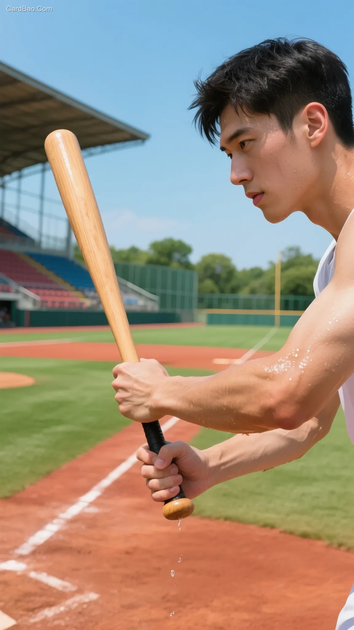 On a sunny outdoor baseball field, the sky is azure, the sunlight is brilliant, and the lighting is bright yet soft. In the distance, there are the field fences, the canopy of the spectator stands, and some indistinct trees. The turf of the field is lush green, and the reddish-brown soil is clearly visible. In the scene, an East Asian handsome man is gripping a wooden baseball bat with both hands, swinging it with skilled, professional athletic form. His gaze is focused intently to one side, his expression serious and full of concentration. The muscles in his arms are well-defined, perfectly showcasing an athlete's strength, and they are covered in sweat, with droplets trickling down his arms. The composition centers on the character, featuring a frontal close-up that presents a flawless image—masterpiece quality, sophisticated, highly detailed, and master-level photography in ultra-high definition 32K.