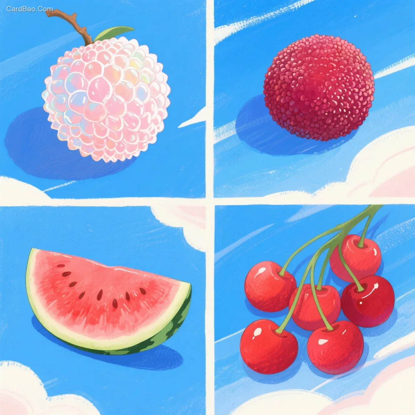 绘本插画,一个风格化的、有点超现实的场景,四宫格,画面一:一颗晶莹剔透的大荔枝。画面二:一颗新鲜饱满的杨梅。画面3:一块切好的西瓜,画面4:一串饱满鲜嫩的大樱桃。夏天氛围,宝蓝色的天,鸟瞰视角,治愈系,32K,超强细节。大笔触,色彩肌理,扁平插画,水彩插画。