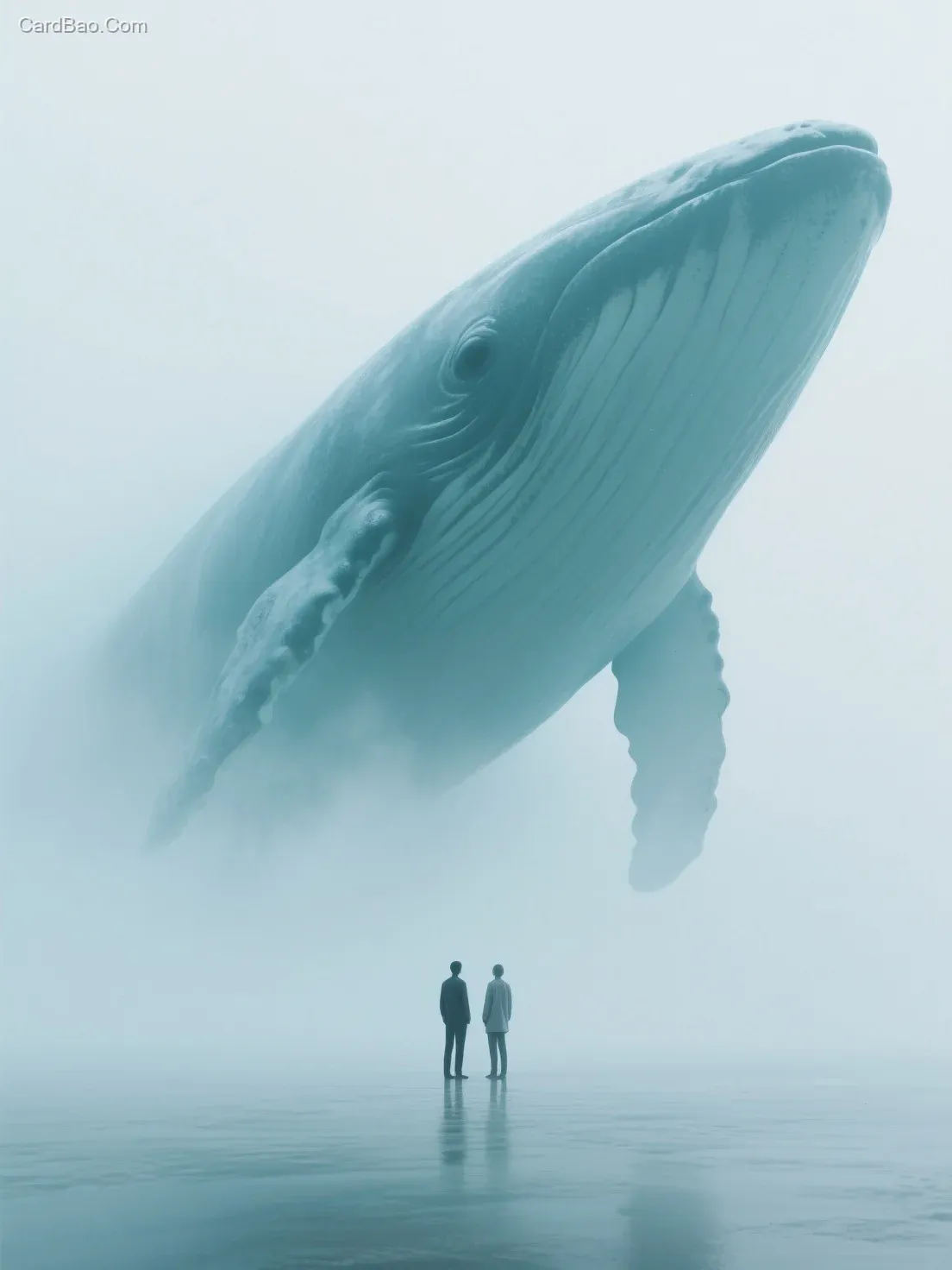 This image presents a minimalist surrealist style. A white void is permeated with dense mist, with tones of blue-green and light gray interwoven. The composition features a massive whale figure that delivers a strong visual impact, creating a mysterious atmosphere. Two human figures stand in the foreground, adding narrative depth and contrast to the scene—as if engaging in a silent gaze with the colossal whale, embodying the essence of metaphorical art. Enhanced by 3D effects, the entire composition boasts a rich sense of layering and achieves high-definition clarity.